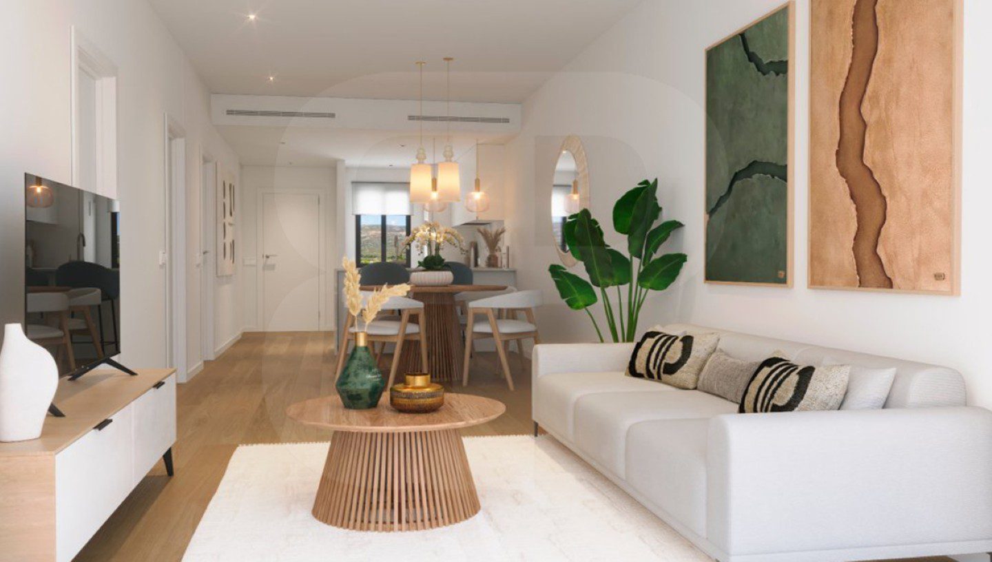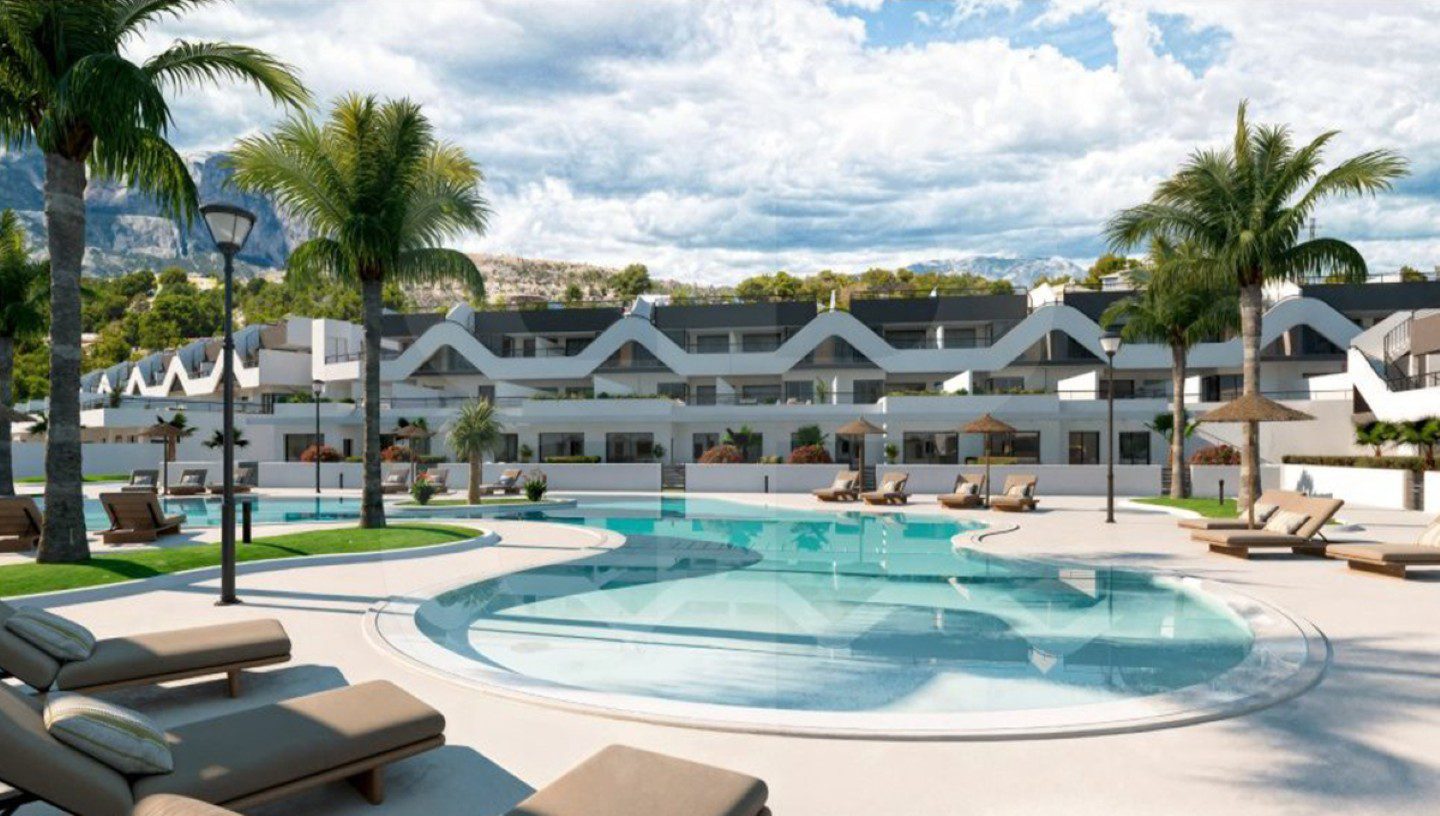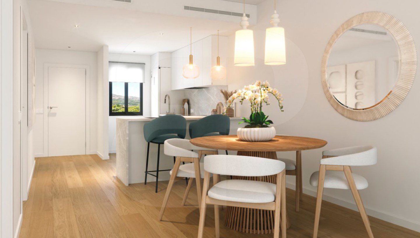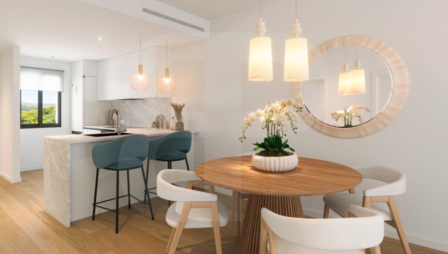 Apartamento en planta baja orientado al sur. Ubicado en Alfaz del Pi. Nueva construcción con dos dormitoritos, dos baños y dispone de salón-comedor con cocina abierta y acceso directo a una terraza cubierta acristalada, que comunica con un jardín privativo. Aerotermia y aire acondicionado por conductos, plaza de garaje privada y techada. Piscina comunitaria y las imágenes mostradas son fotos tipo. Soleado con grandes posibilidades, próximo a zona comercial.