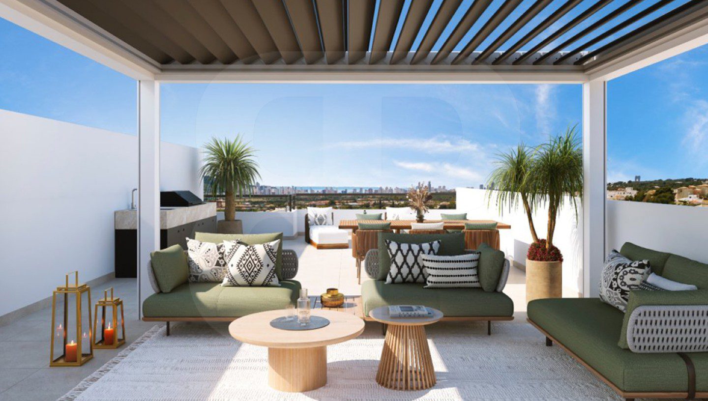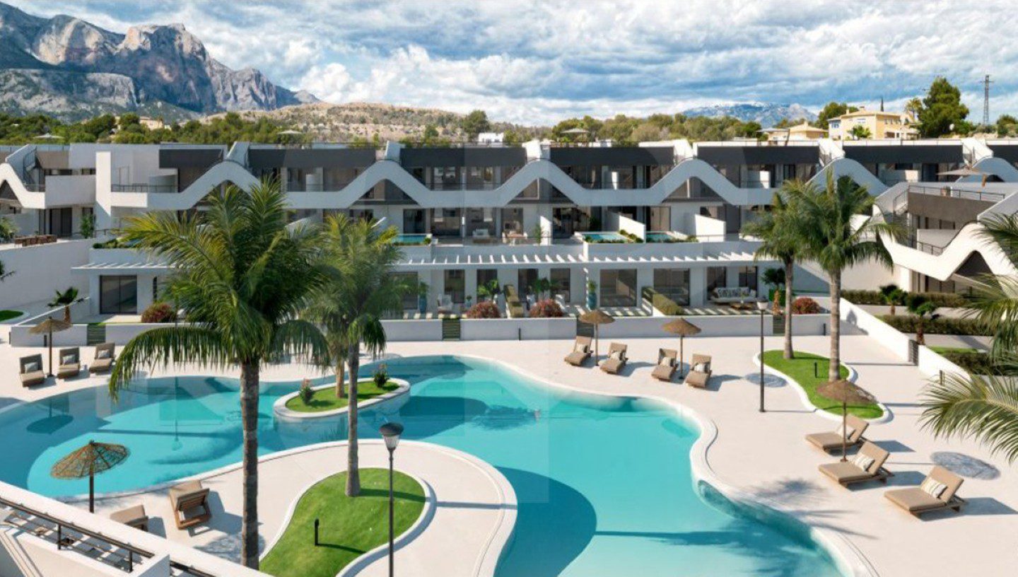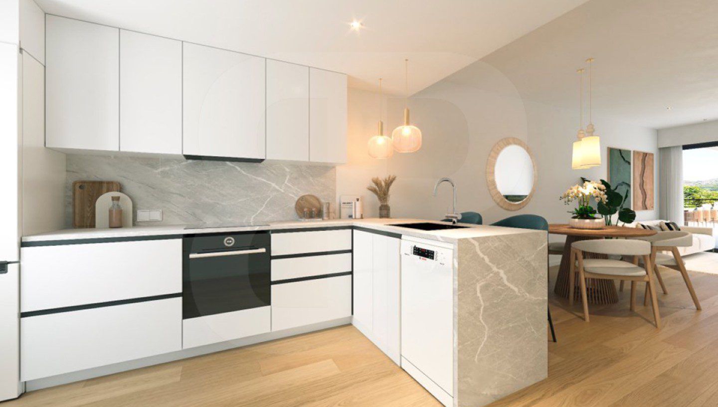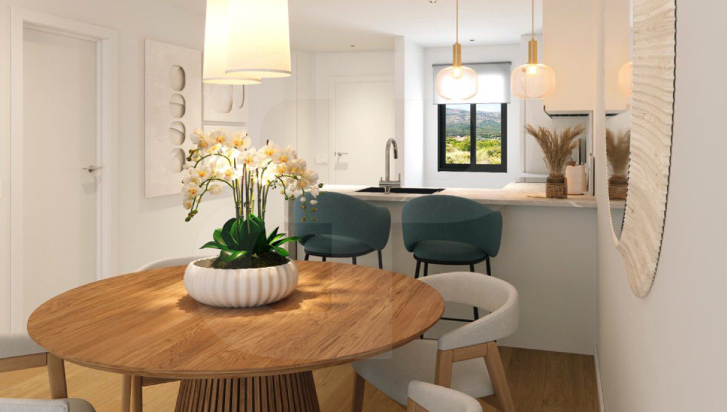 Apartamento en planta baja orientado al sur. Ubicado en Alfaz del Pi. Nueva construcción con dos dormitoritos, dos baños y dispone de salón-comedor con cocina abierta y acceso directo a una terraza cubierta acristalada, que comunica con un jardín privativo. Aerotermia y aire acondicionado por conductos, plaza de garaje privada y techada. Piscina comunitaria y las imágenes mostradas son fotos tipo. Soleado con grandes posibilidades, próximo a zona comercial.