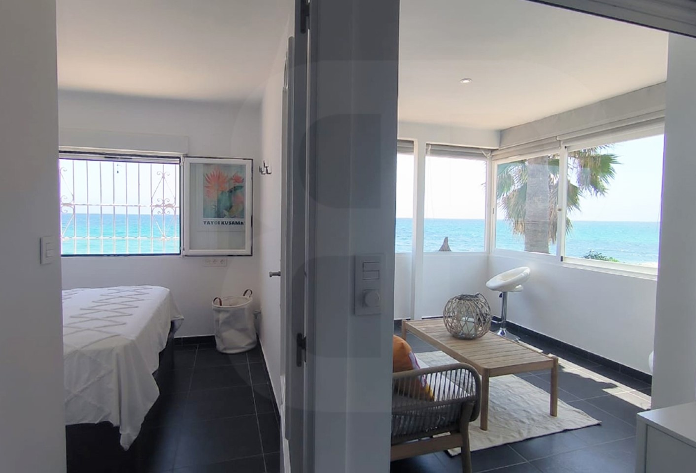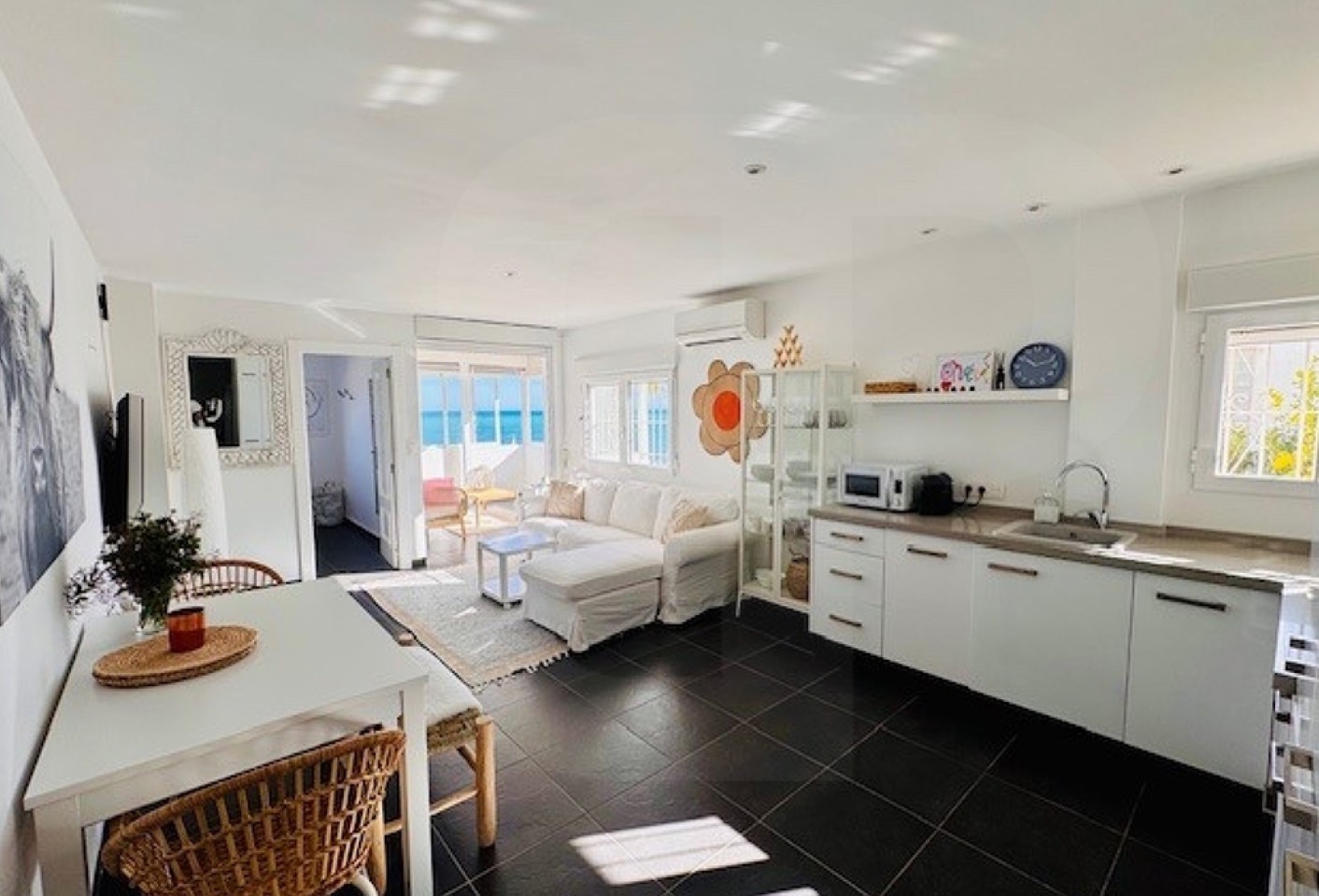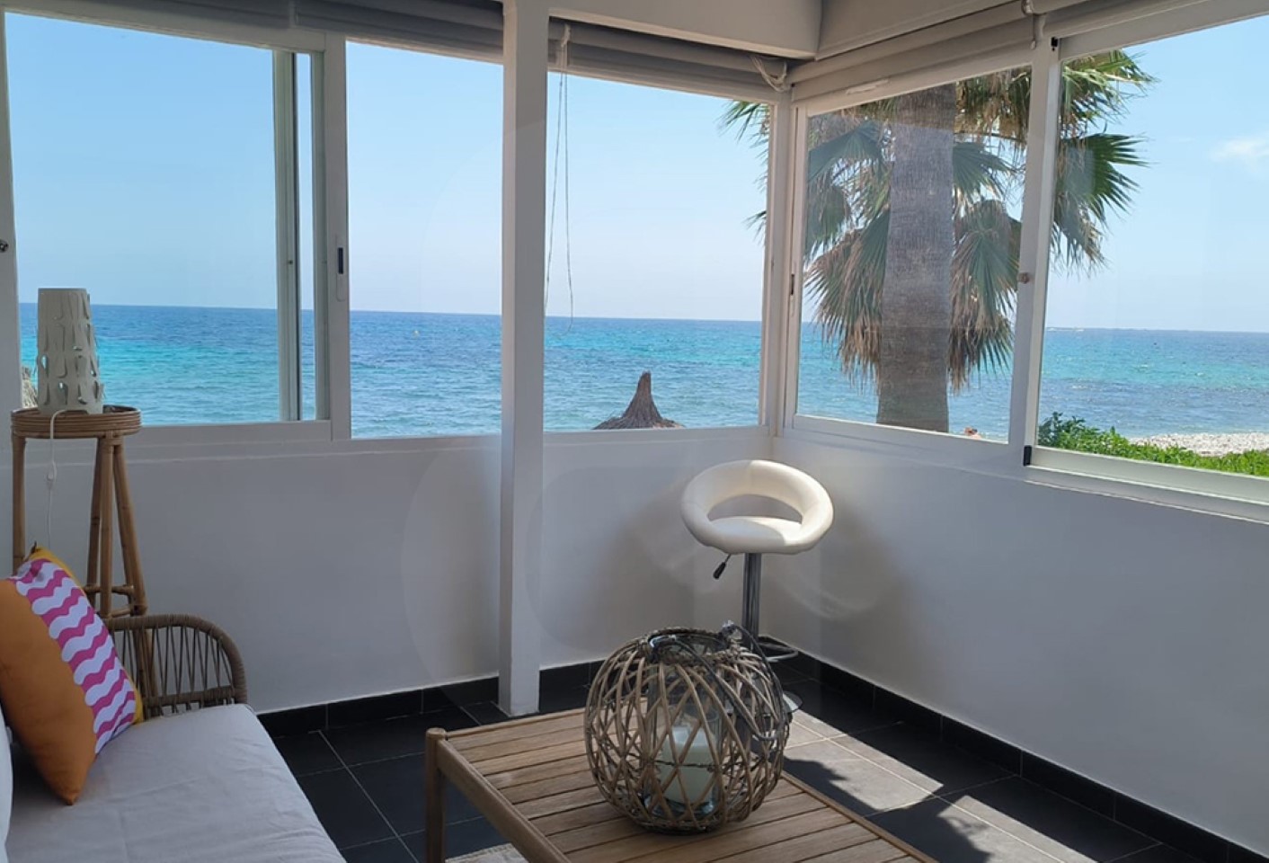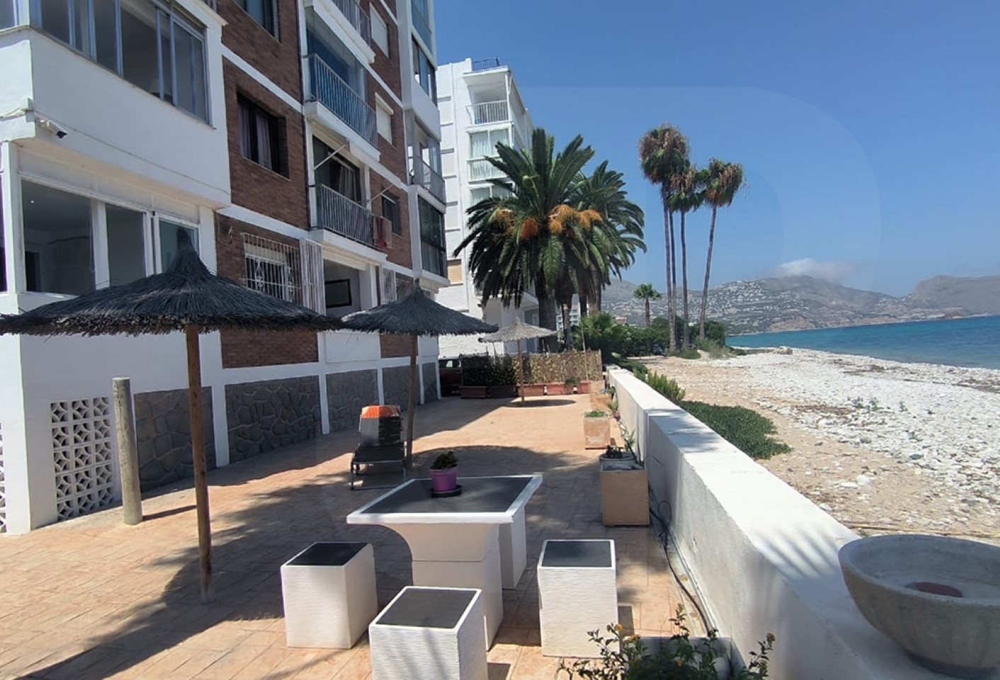 Luminoso apartamento en esquina, ubicado en primera línea con acceso directo a la playa. Se encuentra a poca distancia del centro de Altea. Con un salón-comedor direct0 con una terraza cerrada, ideal para disfrutar de las vistas al mar y la brisa marina. Cocina americana  reformada, con dos dormitorios dobles, uno de ellos con bonitas vistas al mar, y un baño completo. Aire acondicionado, calefacción y garaje. Edificio con zonas comunes, con una terraza ajardinada tipo chill-out con comedor al aire libre, y un amplio solárium comunitario con zona de estar. Próximo a zona comercial. Grandes posibilidades