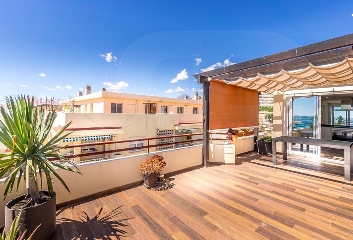 Luminoso apartamento dúplex, ubicado a escasos metros de la playa de La Roda, de Altea. Con un salón-comedor direct0 con una terraza, cocina americana de diseño, dos dormitorios. Completamente reformado con un estilo moderno, el dúplex destaca por su fantástica terraza orientada al sur, ideal para disfrutar de unas preciosas vistas al mar. A través de una escalera de madera natural se accede a la planta superior tipo loft, dos estancias abiertas que pueden destinarse a dormitorios, despacho o zona de ocio, y un segundo baño. Aire acondicionado, calefacción y posibilidad de adquirir plaza de garaje en edificio cercano, 20.000 €. Próximo a zona comercial. Grandes posibilidades.